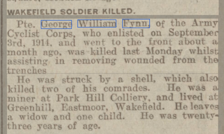 Two months after Irene’s birth their world, like that of so many others, was shaken by the events unfolding in far of Serbia and the consequent declaration of war by Great Britain on 4th August 1914. The following month on 3rd September George volunteered to serve his King and country. A year later on 28th September 1915 he was killed in action during the first engagement of his unit at the battle of Loos en Goehelle – a coal mining town in northern France. Mary would have received the dreaded news in a letter from the War Office not long after his death. A week later the Leeds Mercury carried the announcement with some rare biographical details.