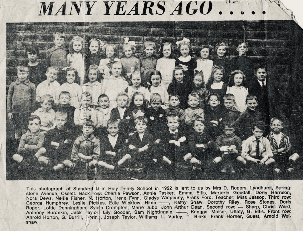 Irene Fynn at her first school, Holy Trinity, Ossett in 1922, back row third from the right wearing a white pinafore dress. Irene moved to Teall’s Yard (now Teall Croft) off Dale Street around 1917 to begin life with her new family. Mary (nee Cooper) her mother had been widowed when George William Fynn was killed at the Battle of Loos in 1915. Irene likely started school on her third birthday. The school was short walk away from Teall’s Yard. Irene was a bright pupil and would go on to pass the entrance exam for Ossett Girls’ Grammar School and the support of a scholarship. She probably left on her fifteenth birthday (1929) to begin work in domestic service.