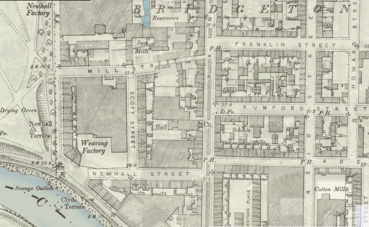 The Paul household, in 1871 was as usual in Victorian Britain large, busy and shoehorned into a small house or tenement. James Paul snr. and Isabella his wife shared the home with their eldest son Thomas (30), his wife, also Isabella (32), James jnr. (18), George (16), William (14) and Sarah (11). James snr. was a handloom weaver originally from Barony, Glasgow. Records suggest James snr. followed his trade at various locations around Glasgow before settling in 29 Newhall Street, Bridgeton in the late 1850s. James jnr. was born in 1853 during a spell in Kilbarchan, Renfrewshire, a centre of the dwindling handloom weaving industry. In the 1861 Census James snr. still described his occupation as “cotton hand-loom weaver”, however, it seems likely that that he now worked as a power loom operative in the Weaving Factory at the end of Newhall Street (see below).