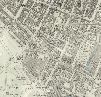 Ten years later when living on Clyde Street, James snr. describes his occupation as “Carpet Weaver”. His place of work is not stated but would almost certainly have been at James Templeton & Co. Carpet Factory to the east of Glasgow Green. Clyde Street is a few hundred yards to the north east.